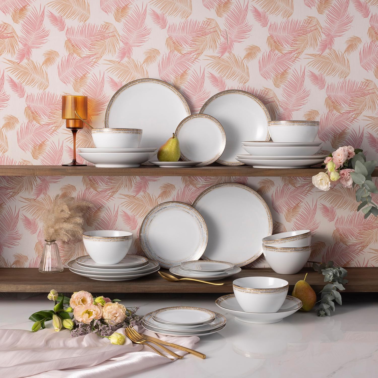 This comprehensive set includes 6 dinner plates, 6 salad plates, 6 bread and butter/appetizer plates, 6 pasta bowls, and 6 cereal bowls, perfect for family meals or entertaining guests with style and ease.